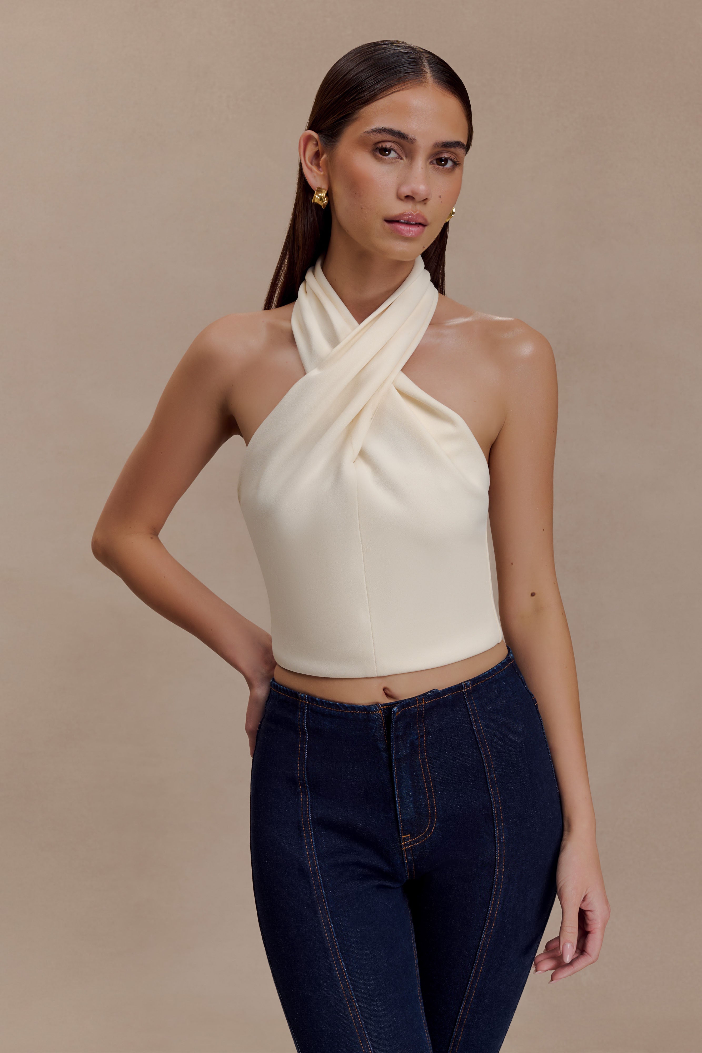 The MARION Cross Over Top is a modern statement piece with a sleek, cropped silhouette. Featuring a cross halter neckline that fastens with a back button closure, it frames the shoulders with bold simplicity. Fully lined for a smooth fit and finished with an exposed centre back zip, this top pairs effortlessly with tailored trousers or its coordinating bottoms for an elevated set moment.