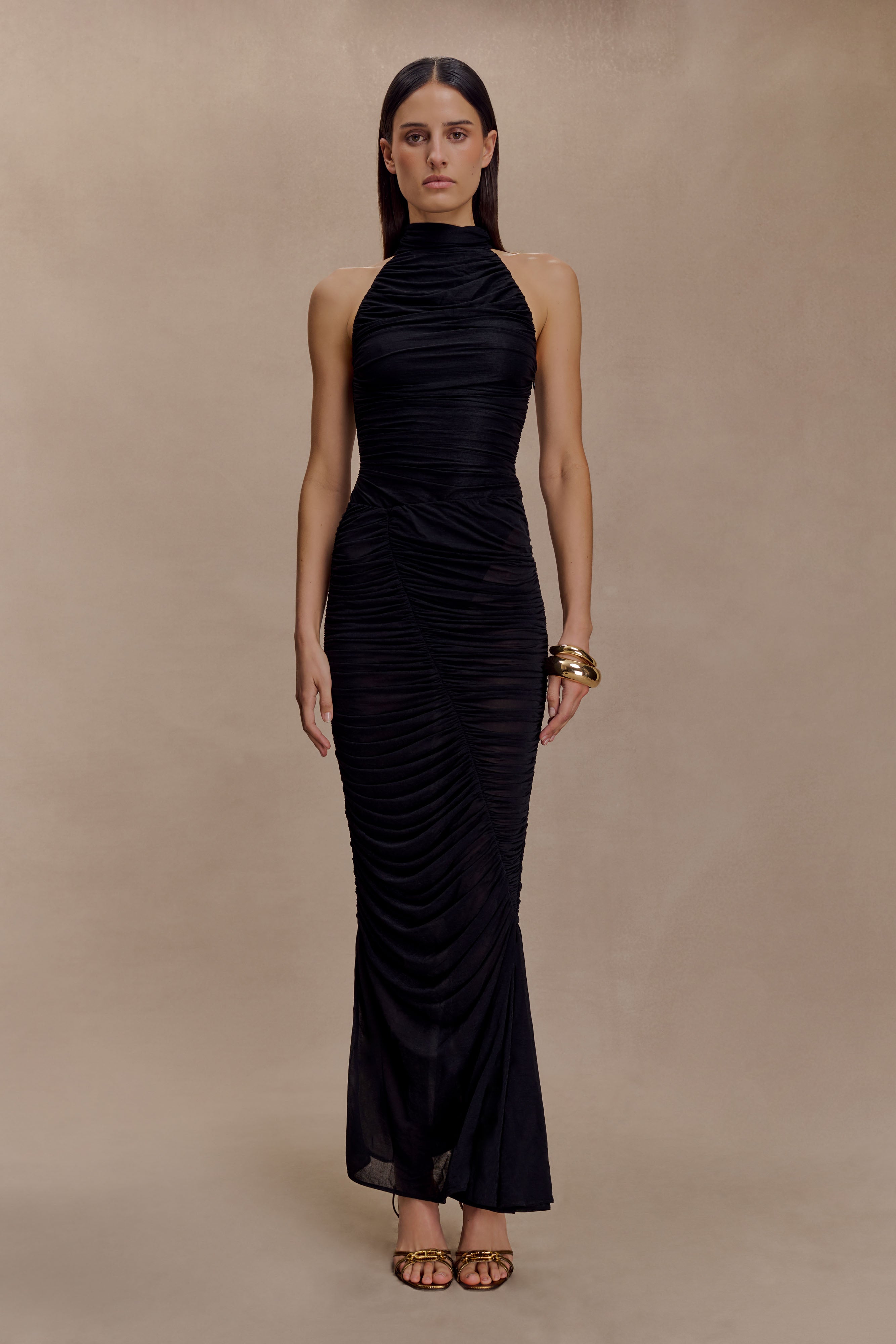 The MATILDA Ruched Mesh Maxi Skirt is designed to flatter with soft gathering and a sleek, elongating silhouette. Sitting at the mid waistline, it’s detailed with ruched accents throughout and a front godet insert that adds subtle volume and flow. Fully lined for comfort and cut to a maxi length, this skirt balances structured fit with fluid movement—perfect styled with its coordinating bodysuit for a statement set moment.
